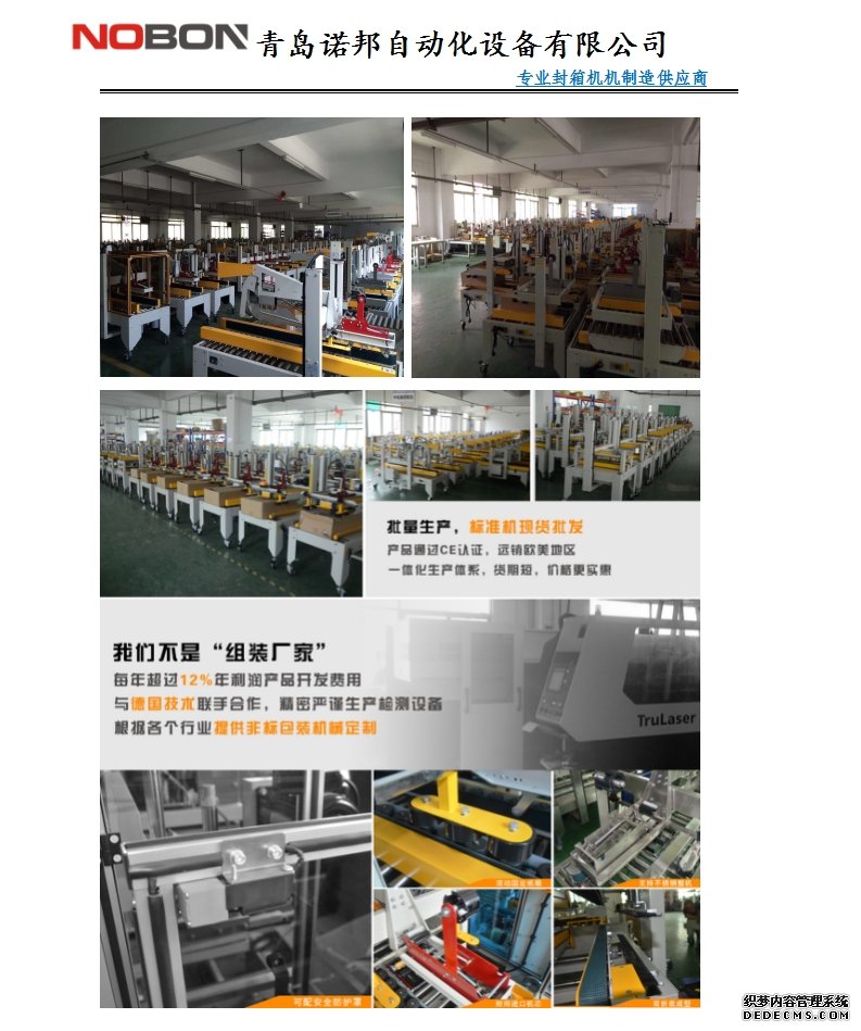 青島諾邦自動化設備有限公司專注包裝12年經驗,是一家專業從事研發及銷售封箱機,紙箱封箱機,膠帶封箱機,全自動封箱機,封箱打包一體機等各種自動化設備企業。青島諾邦以多年的技術經驗和優質的售后服務在行業內贏得普遍好評。下面是我們諾邦封箱機細節展示: